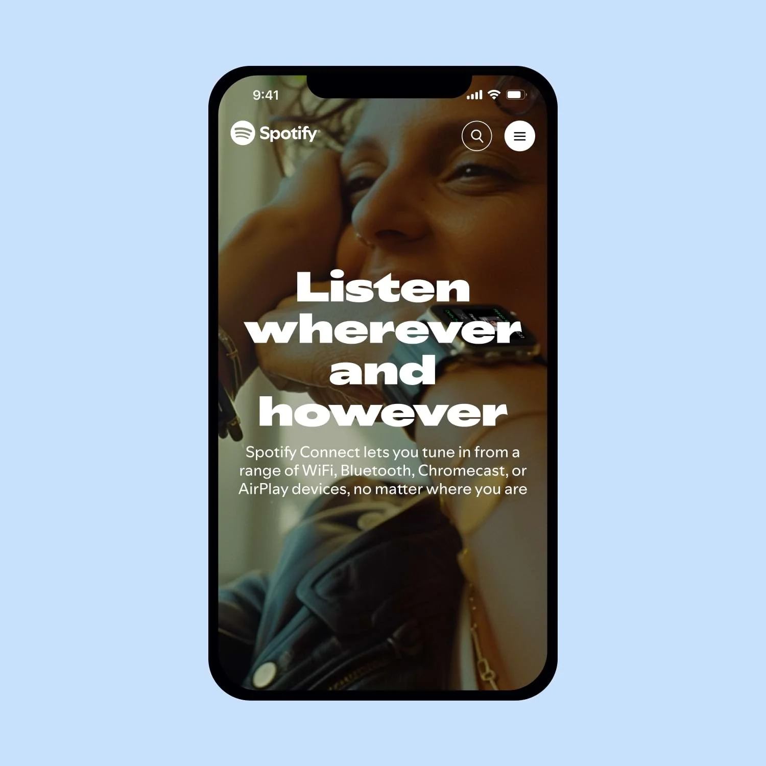 At CC Studio, my team and I developed a refreshed visual design for Spotify Connect, an external site where users can explore how to control audio playback on one device remotely from another.